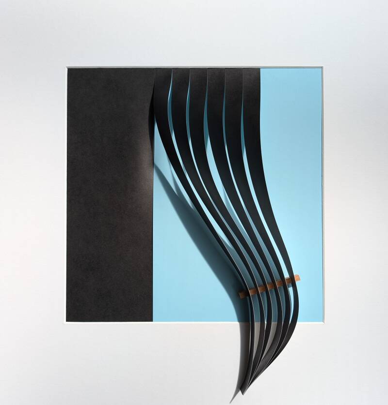 Meine Objekte bestehen aus mehreren Papierstreifen, die teilweise gefaltet sind und verschiedene Farben und Formen aufweisen.